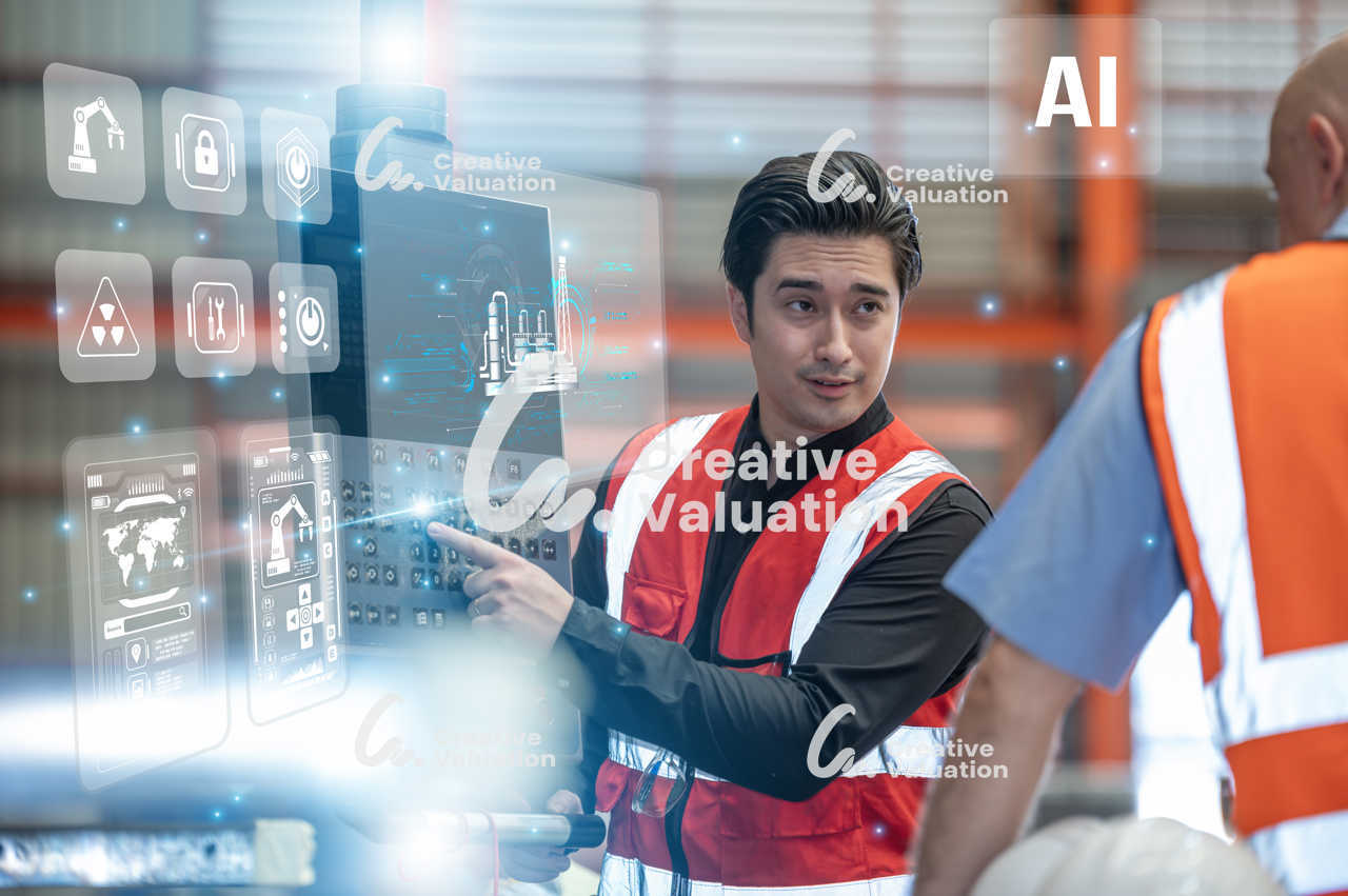 Industrial supervisor using AI artificial intelligence dashboard to analyze production data in factory.