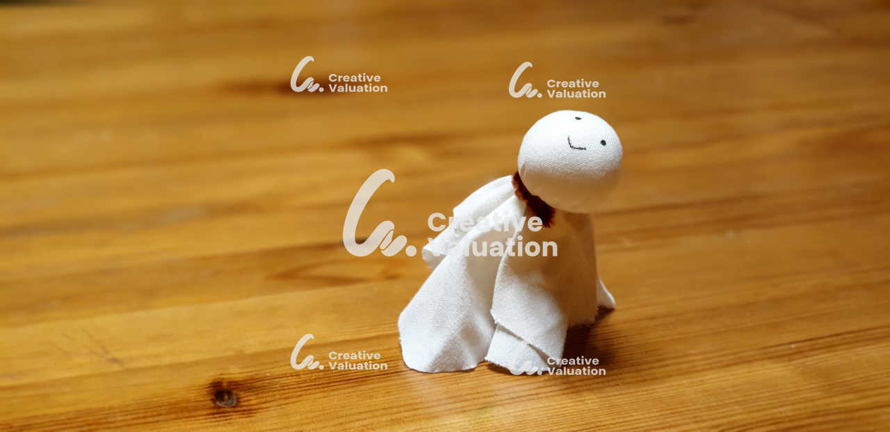 Close-up photo of handmade Teru Teru Bozu doll, a tradition Japanese cloth talisman believed to bring good weather and stop rain.