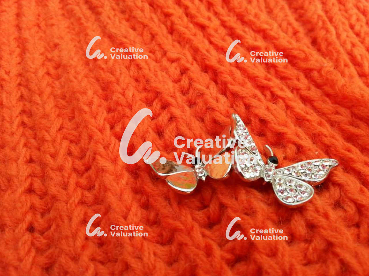 Sparking Silver Butterfly Brooch with Rhinestone on orange knitted fabric